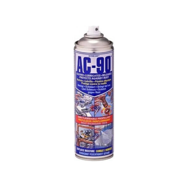 Το AC-90 είναι βιομηχανικό λιπαντικό πολλαπλών χρήσεων σε σπρέι και δεν περιέχει σιλικόνη ή CFC. Το AC-90 θα διεισδύσει και θα απελευθερώσει σκουριασμένα ή μπλοκαρισμένα εξαρτήματα. Μετατοπίζει την υγρασία από τα συστήματα ανάφλεξης των οχημάτων και βοηθά στην εκκίνηση και την ομαλή λειτουργία. Απλά ψεκάστε με το λιπαντικό πάνω από το εξωτερικό όλων των αγωγών, των απαγωγών μπουζί και όλων των ηλεκτρικών εξαρτημάτων για να αποφύγετε ελαττώματα που προκαλούνται από την υγρασία.